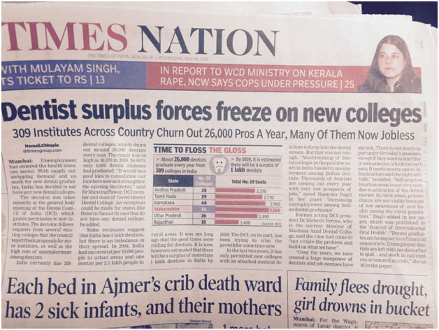 Association journal JIOH article was recently cited by leading news paper "The Times of India". More information is available on link http://m.timesofindia.com/home/education/news/Dentist-surplus-forces-freeze-on-new-colleges-in-India/articleshow/52317522.cms